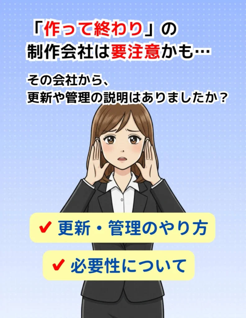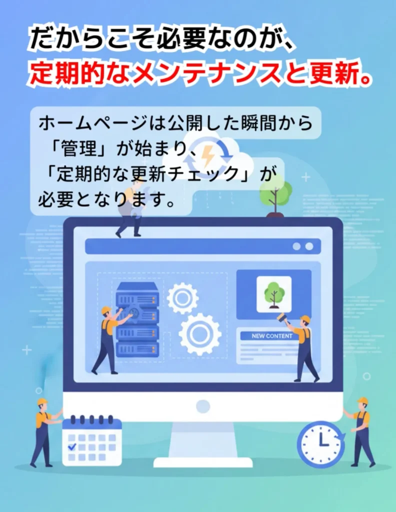 ホームページは公開した瞬間から「管理」が始まり、定期的な更新チェックが必要となります。