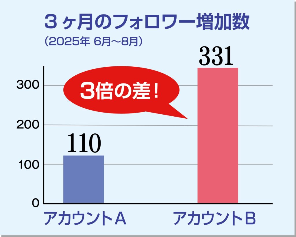2つのアカウントはほぼ投稿数は同じでしたが、フォロワーの増加数には、3倍もの差が生まれました。