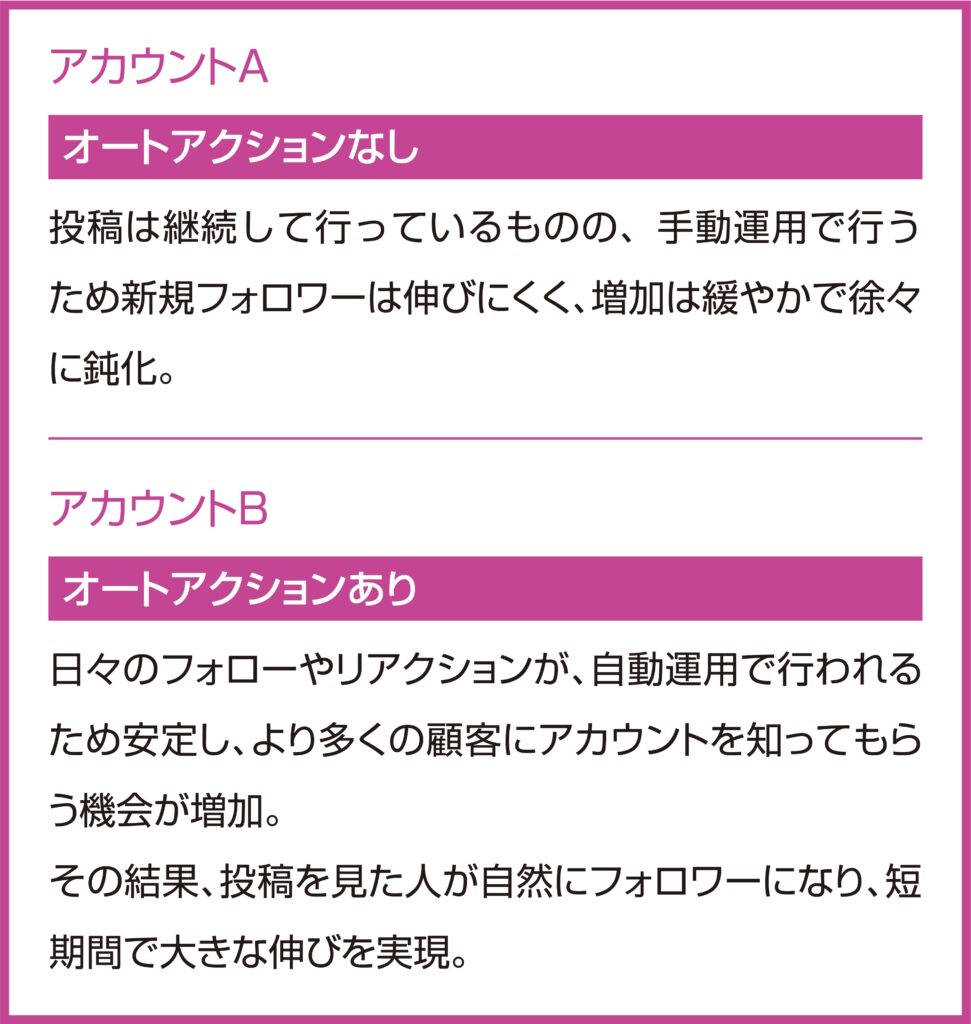 3倍差の理由は、Instagram運用ツール「インスタスタイル」のオプション機能『オートアクション』を利用しているか、いないかの違いです。