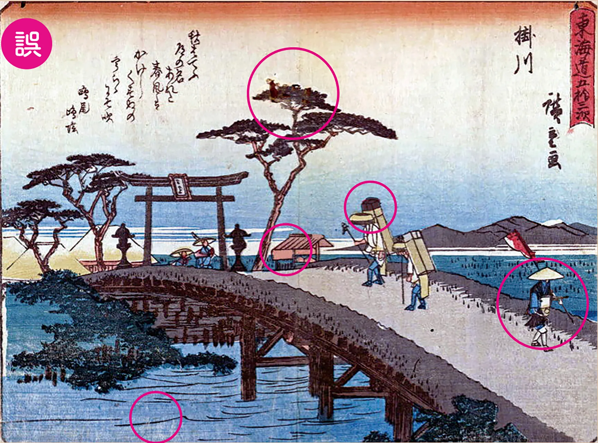 今号の間違い探しは歌川広重 東海道五拾三次「日坂宿」。